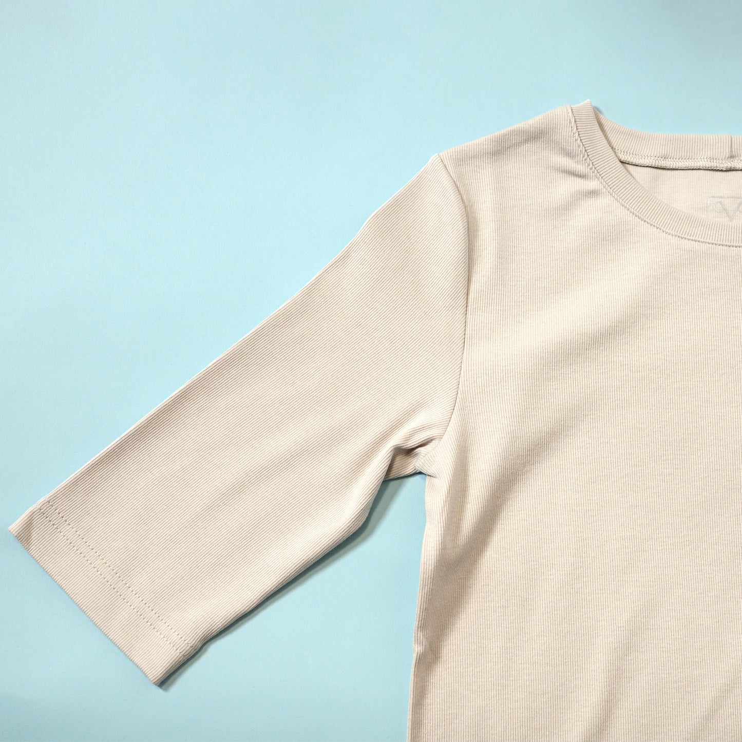 ネックの開きは少し詰まらせてあり、袖の長さはひじの辺りまでの五分袖なので 落ち着いて洗練された印象です。